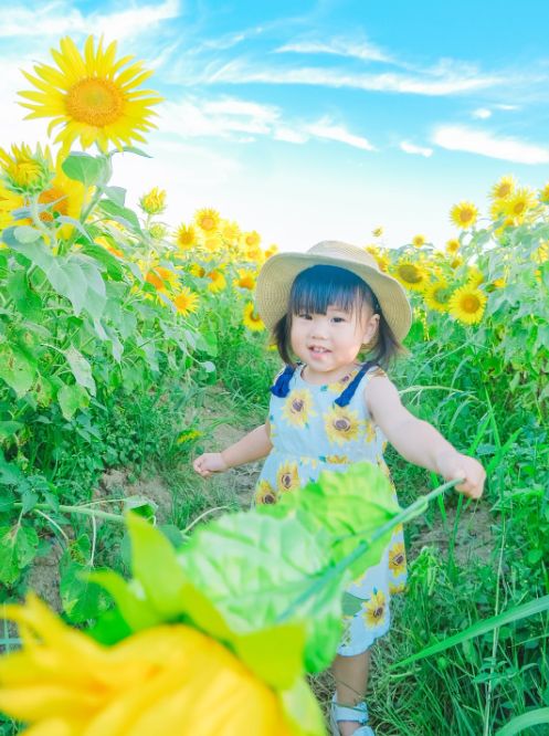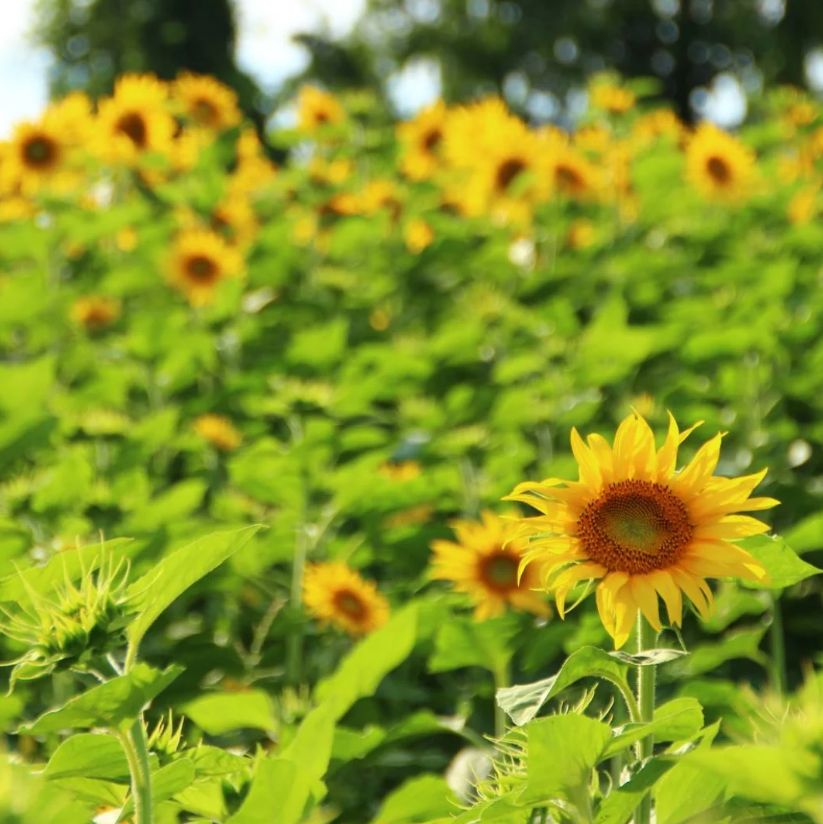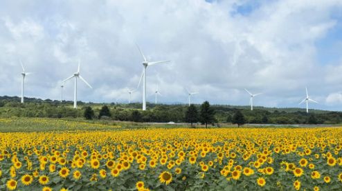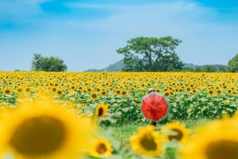 青空の下で元気いっぱいに咲くひまわりと、